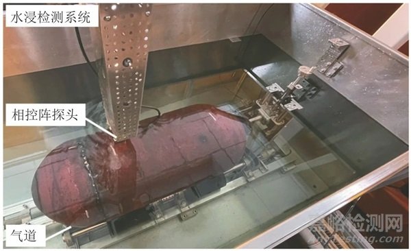 采用五軸聯(lián)動相控陣超聲水浸C掃描自動檢測系統(tǒng)對加工內(nèi)外表面刻槽的瓶體試件進(jìn)行檢測試驗(yàn)(為模擬完整氣瓶,將割開后加工表面刻槽的兩部分瓶體重新焊在一起)。檢測現(xiàn)場如圖9所示。