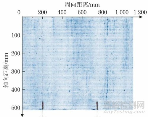 針對周向缺陷檢測,利用水楔技術(shù)在水/鋼二層界面間產(chǎn)生波型轉(zhuǎn)換進(jìn)行檢測,相控陣C掃描結(jié)果如圖11所示,圖中可清晰看到代表缺陷的圖像特征:兩條橫向缺陷特征在周向間隔距離為534 mm,約等于周長的一半,與實(shí)際缺陷位置相同;而軸向上兩者不在同一位置,這是兩者聲程不一致造成的(外表面周向缺陷所用反射波為二次反射波,而檢測到內(nèi)表面周向缺陷為一次反射波),通過數(shù)據(jù)分析可確認(rèn)兩者在同一軸向位置。