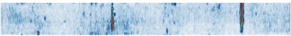 對瓶體筒身軸向缺陷,通過調(diào)節(jié)偏心距使入射聲束在鋼瓶中產(chǎn)生純橫波進(jìn)行檢測,相控陣C掃描結(jié)果如圖10所示,圖中可清晰看到條狀的特征圖像(代表內(nèi)外表面的刻槽)。