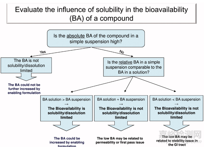 這就引出了作者經(jīng)常從他的藥物化學(xué)同事那里收到的一個(gè)重要問(wèn)題,當(dāng)時(shí)正在討論最近合成的難溶性分子:“我們能否通過(guò)增加水溶性來(lái)提高這種分子的生物利用度?真正的潛在問(wèn)題應(yīng)該是:“這種分子溶解度的生物利用度是否有限?為了簡(jiǎn)單回答這個(gè)問(wèn)題,強(qiáng)生科學(xué)家建立了一個(gè)簡(jiǎn)單的決策樹(shù),用于處理生物利用度差的不同情況(圖1)。