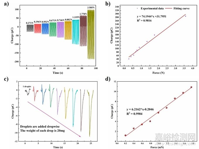 圖2:a) 和 b)傳感器輸出性能;c) 和 d) 微小力作用下的輸出相應(yīng)(圖片來自原文)