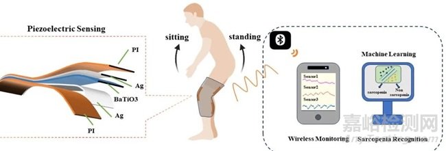 肌肉減少癥的特征是骨骼肌質(zhì)量、力量和功能的逐漸喪失,是一種普遍的年齡相關(guān)綜合征,與其他疾病的發(fā)病率和老年人死亡率增加有關(guān)。肌肉減少癥的后果不僅僅是身體損傷,還會(huì)影響整體健康、獨(dú)立性和生活質(zhì)量。早期篩查肌少癥對(duì)于及時(shí)干預(yù)和改善臨床結(jié)果至關(guān)重要。然而,評(píng)估肌肉質(zhì)量和功能的傳統(tǒng)方法,如雙能 X 射線吸收測(cè)定法 (DXA)、生物電阻抗分析 (BIA)、計(jì)算機(jī)斷層掃描 (CT) 和握力測(cè)量,由于成本高、復(fù)雜性高,并且需要專門的設(shè)備和專業(yè)知識(shí),通常不適用于大規(guī)模篩查和長(zhǎng)期監(jiān)測(cè)。日常體能活動(dòng)評(píng)估是肌少癥篩查的重要方法,而這種評(píng)估方式具有延時(shí)性并且需要專業(yè)人員進(jìn)行,無法實(shí)時(shí)監(jiān)測(cè)自己的健康狀態(tài)。而近年來,可穿戴系統(tǒng)已成為一種很有前途的技術(shù),可以通過監(jiān)測(cè)機(jī)械刺激、產(chǎn)生電信號(hào)和檢測(cè)身體運(yùn)動(dòng)來滿足對(duì)肌少癥人群進(jìn)行識(shí)別與監(jiān)測(cè)這些要求。研究團(tuán)隊(duì)通過制備的鈦酸鋇壓電薄膜構(gòu)建了一個(gè)可穿戴下肢運(yùn)動(dòng)監(jiān)測(cè)系統(tǒng),可以實(shí)現(xiàn)下肢運(yùn)動(dòng)狀態(tài)的監(jiān)測(cè),并根據(jù)機(jī)器學(xué)習(xí)分類模型實(shí)現(xiàn)了肌少癥人群的高準(zhǔn)確篩查。