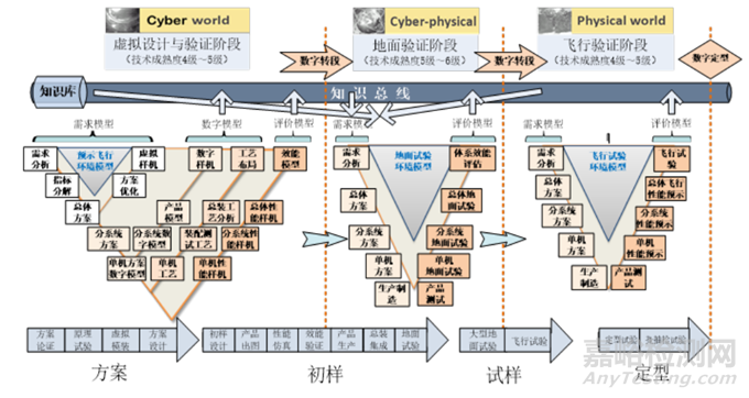 第一階段,虛擬設(shè)計(jì)與研制階段:包括方案論證、方案設(shè)計(jì)、方案詳細(xì)設(shè)計(jì) 3 個(gè)子階段。該階段將在賽博空間完成裝備數(shù)字模型和性能模型,完成產(chǎn)品數(shù)字化設(shè)計(jì),并通過(guò)虛擬裝配對(duì)設(shè)計(jì)準(zhǔn)確性進(jìn)行檢驗(yàn),通過(guò)虛擬飛行試驗(yàn)對(duì)設(shè)計(jì)方案、性能模型進(jìn)行考核,對(duì)總體性能進(jìn)行評(píng)估,并通過(guò)設(shè)計(jì)評(píng)審,使技術(shù)成熟度達(dá)到 4~5 級(jí),完成數(shù)字模型、性能模型的數(shù)字轉(zhuǎn)段,轉(zhuǎn)入地面試驗(yàn)階段。