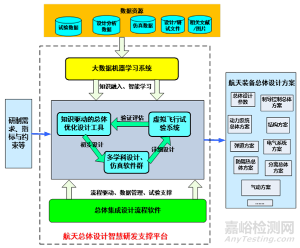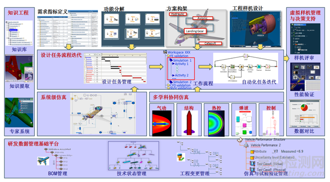 知識(shí)驅(qū)動(dòng)的總體優(yōu)化設(shè)計(jì)工具以軟件打通飛行器總體設(shè)計(jì)流程,實(shí)現(xiàn)裝備總體設(shè)計(jì)過(guò)程的參數(shù)化與數(shù)據(jù)化,以總體設(shè)計(jì)知識(shí)庫(kù)、模型庫(kù)實(shí)現(xiàn)裝備總體方案的智能優(yōu)化與總體設(shè)計(jì)的輔助決策支持。大數(shù)據(jù)機(jī)器學(xué)習(xí)系統(tǒng)對(duì)航天裝備設(shè)計(jì)、計(jì)算、地面試驗(yàn)與飛行試驗(yàn)的海量歷史數(shù)據(jù)基于大數(shù)據(jù)技術(shù)、機(jī)器學(xué)習(xí)方法進(jìn)行處理、集成與智能學(xué)習(xí)和知識(shí)挖掘,為總體優(yōu)化設(shè)計(jì)提供知識(shí)驅(qū)動(dòng)與案例學(xué)習(xí),為虛擬試驗(yàn)與評(píng)估提供智能模型與智能推理,為多學(xué)科設(shè)計(jì)仿真軟件系統(tǒng)提供知識(shí)融入與驗(yàn)證確認(rèn)。多學(xué)科設(shè)計(jì)仿真軟件群為航天裝備總體設(shè)計(jì)提供相關(guān)的各專(zhuān)業(yè)設(shè)計(jì)仿真軟件,用于裝備總體方案詳細(xì)設(shè)計(jì)與高效并行計(jì)算分析。虛擬飛行試驗(yàn)系統(tǒng)形成模型與數(shù)據(jù)混合驅(qū)動(dòng)的智能仿真方法,實(shí)現(xiàn)高精度、高效率、大子樣的多學(xué)科耦合虛擬試驗(yàn),融合有限狀態(tài)的地面、飛行試驗(yàn),實(shí)現(xiàn)大型地面試驗(yàn)與飛行試驗(yàn)的數(shù)字孿生,實(shí)現(xiàn)虛實(shí)融合的全剖面飛行性能鑒定與評(píng)估??傮w集成設(shè)計(jì)流程軟件實(shí)現(xiàn)對(duì)裝備設(shè)計(jì)任務(wù)與設(shè)計(jì)流程的管理與規(guī)劃,對(duì)裝備設(shè)計(jì)過(guò)程進(jìn)行跟蹤與控制,實(shí)現(xiàn)設(shè)計(jì)流程接口的標(biāo)準(zhǔn)化與統(tǒng)一化設(shè)計(jì)過(guò)程數(shù)據(jù)的統(tǒng)一化管理,實(shí)現(xiàn)虛擬飛行試驗(yàn)系統(tǒng)研制過(guò)程與試驗(yàn)運(yùn)行的自動(dòng)化、敏捷化、可視化。
