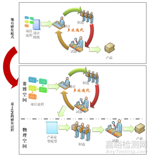 現(xiàn)有的研發(fā)設(shè)計(jì)體系雖然實(shí)現(xiàn)了紙質(zhì)文檔圖紙的電子化,但整個(gè)研發(fā)過(guò)程依舊是電子文檔與實(shí)物模型的迭代,依舊存在更改單過(guò)多、迭代不充分等問(wèn)題,從而導(dǎo)致型號(hào)研制成本高、研發(fā)設(shè)計(jì)周期難控制。同時(shí),研發(fā)流程與科研計(jì)劃狀態(tài)和目標(biāo)不一致,缺乏動(dòng)態(tài)反饋和聯(lián)動(dòng)。如圖 5 所示,為了解決該弊端,在研制過(guò)程中引入賽博 - 物理系統(tǒng)(cyber-physical systems,CPS)理論,將整個(gè)智慧研發(fā)體系轉(zhuǎn)化成一個(gè)賽博 - 物理系統(tǒng),將現(xiàn)有的電子文檔與實(shí)物的迭代過(guò)程轉(zhuǎn)變成賽博 - 物理空間內(nèi)基于系統(tǒng)工程模型的迭代,通過(guò) CPS 系統(tǒng)實(shí)時(shí)感知研發(fā)流程和計(jì)劃管理的每個(gè)狀態(tài)和進(jìn)度信息,通過(guò)計(jì)算資源和物理資源深度融合并實(shí)時(shí)交互,實(shí)現(xiàn)對(duì)科研狀態(tài)的實(shí)時(shí)管控。在賽博空間中基于各類(lèi)模型的設(shè)計(jì)和驗(yàn)證得到充分迭代,因此能夠確保實(shí)物樣機(jī)在物理空間的一次試驗(yàn)成功。