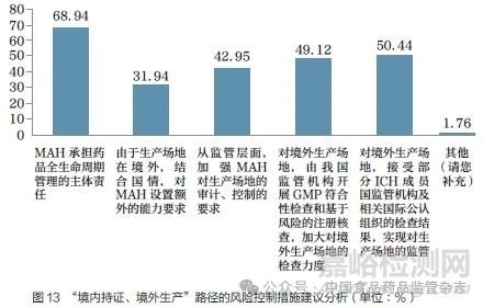 調(diào)研結(jié)果顯示(圖13),針對有效控制“境內(nèi)持證、境外生產(chǎn)”路徑實施的風險,68.94%的調(diào)研對象認為MAH 應當承擔藥品全生命周期管理的主體責任;50.44% 的調(diào)研對象認為應通過接受部分ICH 成員國監(jiān)管機構(gòu)及相關(guān)國際公認組織對境外生產(chǎn)場地的檢查結(jié)果實現(xiàn)對生產(chǎn)場地的監(jiān)管;49.12% 的調(diào)研對象認為應加大我國監(jiān)管機構(gòu)對境外生產(chǎn)場地GMP 符合性檢查和基于風險的注冊核查的檢查力度;42.95% 的調(diào)研對象認為應從監(jiān)管層面加強MAH 對生產(chǎn)場地的審計、控制的要求;31.94% 的調(diào)研對象認為對境外生產(chǎn)場地可結(jié)合國情對MAH 設(shè)置額外的能力要求。“其他”建議包括以法規(guī)形式明確境外生產(chǎn)企業(yè)必須在滿足所在國法規(guī)技術(shù)要求的基礎(chǔ)上執(zhí)行我國的法規(guī)和要求,發(fā)生爭議應當按照我國的法律在我國解決。
