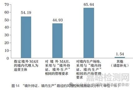 調(diào)研結(jié)果顯示(圖14),為有效控制“ 境外持證、境內(nèi)生產(chǎn)” 路徑實施的風險,65.64%的調(diào)研對象認為可對境內(nèi)生產(chǎn)場地采用與“ 境內(nèi)持證、境內(nèi)生產(chǎn)” 相同的場地管理要求;54.19% 的調(diào)研對象認為可指定境外MAH 的境內(nèi)代理人為追責主體;44.93% 的調(diào)研對象認為對境外MAH 可采用與“境外持證、境外生產(chǎn)” 相同的管理要求。“其他”建議包括應由境外持證人負全責, 但生產(chǎn)場地應由所在地進行監(jiān)管, 藥品的定價、采購等也應按照境內(nèi)生產(chǎn)藥品進行管理。