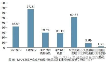 調(diào)研結(jié)果顯示(圖15),認為上市放行不能委托的調(diào)研對象最多(77.31%),這與我國目前法規(guī)要求一致,反映了法規(guī)不允許MAH 委托上市放行的理念被大部分業(yè)內(nèi)人士接受。調(diào)研對象選擇不能委托第三方的事項還包括生產(chǎn)變更管理(60.57%)、生產(chǎn)放行(42.07%)、生產(chǎn)過程質(zhì)量檢驗(29.74%)、QC 放行檢驗(28.19%)等。值得注意的是,8.59% 的調(diào)研對象認為上述事項均可委托。隨著我國MAH 制度的成熟,如果MAH 作為責任主體能夠完全承擔藥品全生命周期的風險,那么這個觀點可在未來繼續(xù)探討。