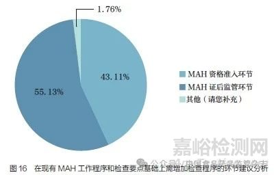 調(diào)研結(jié)果顯示(圖16),55.13% 的調(diào)研對象認為應增加MAH 證后監(jiān)管環(huán)節(jié)的檢查工作;43.11% 的調(diào)研對象認為應增加MAH 資格準入環(huán)節(jié)的檢查。“其他”建議包括應重點檢查質(zhì)量管理人員的資質(zhì)和MAH 履責情況、重點加強持C 證企業(yè)(受托生產(chǎn)企業(yè))的檢查等,這從側(cè)面反映了部分MAH 對受托生產(chǎn)企業(yè)的管控較弱。