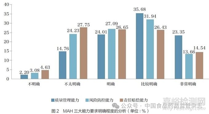 調(diào)研結(jié)果顯示(圖2),調(diào)研對象認為法規(guī)對MAH 質(zhì)量管理能力要求(尤其是MAH 并非生產(chǎn)企業(yè)時)明確(包括明確、比較明確、非常明確) 的占比最高(83.04%),認為對MAH 風險防控能力要求明確( 包括明確、比較明確、非常明確)的占72.69%, 認為對MAH 責任賠償能力要求明確(包括明確、比較明確、非常明確)的占比最少(67.62%)。調(diào)研結(jié)果表明,法規(guī)對MAH 責任賠償能力方面的要求仍有待進一步明確。