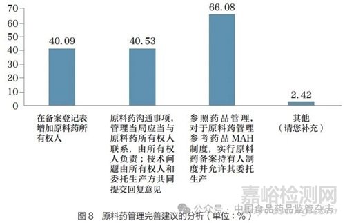 調(diào)研結(jié)果顯示(圖8),66.08% 的調(diào)研對象支持實行原料藥備案持有人制度并允許委托生產(chǎn);40.53% 的調(diào)研對象認為監(jiān)管機構(gòu)應當與原料藥所有權(quán)人聯(lián)系溝通申報事項,技術(shù)問題由所有權(quán)人和委托生產(chǎn)方共同提交回復意見;40.09% 的調(diào)研對象認為可在備案登記表中增加原料藥所有權(quán)人。目前,原料藥的實際所有權(quán)人無法直接向藥審中心遞交原料藥的登記資料,對原料藥生產(chǎn)、注冊登記及上市后產(chǎn)品維護環(huán)節(jié)的責任落實均產(chǎn)生一定影響,有待探討優(yōu)化原料藥管理流程。