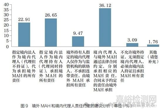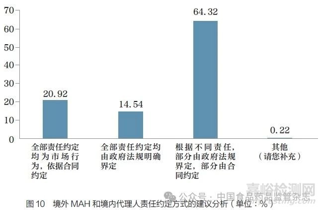 調(diào)研結(jié)果顯示(圖10),64.32% 的調(diào)研對象認為應通過政府法規(guī)和合同兩種方式來約定境外MAH 和境內(nèi)代理人各自應承擔的責任;20.92% 的調(diào)研對象認為全部責任約定均為市場行為,依據(jù)合同約定;14.54% 的調(diào)研對象認為全部責任約定均由政府法規(guī)明確界定。超過半數(shù)的調(diào)研對象認為應通過政府法規(guī)和合同兩種方式來約定境外MAH和境內(nèi)代理人各自應承擔的責任,比例超過單純使用其中一種手段來約定的情況。這一結(jié)果反映了由于境外MAH 與境內(nèi)代理人的業(yè)務(wù)模式不同,單一的責任約定方式可能無法滿足各相關(guān)方的利益訴求,有必要探討多種方式并存的可行性以確保責任的落實。