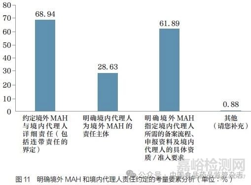調(diào)研結(jié)果顯示(圖11),為進一步明確境外MAH 與境內(nèi)代理人的責任, 68.94% 的調(diào)研對象認為應約定境外MAH 與境內(nèi)代理人詳細責任( 包括連帶責任);61.89% 的調(diào)研對象認為應明確境外MAH 指定境內(nèi)代理人所需的備案流程、申報資料及境內(nèi)代理人的具體資質(zhì)/ 準入要求;28.63% 的調(diào)研對象認為應明確境內(nèi)代理人為境外MAH 的責任主體。