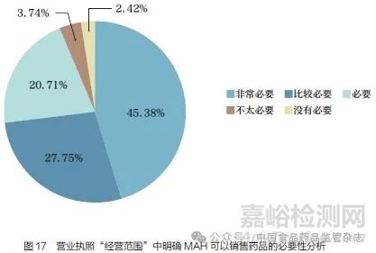 調(diào)研結(jié)果顯示(圖17),93.84% 的調(diào)研對象認為有必要(包括必要、比較必要、非常必要)在營業(yè)執(zhí)照的“經(jīng)營范圍”中明確MAH 可以銷售藥品并統(tǒng)一表述。這一建議有助于在以MAH 為責任主體的跨省經(jīng)營活動中采用一致的經(jīng)營業(yè)務(wù)范圍,并統(tǒng)一對MAH 在經(jīng)營環(huán)節(jié)職責的理解。