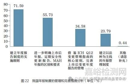 調(diào)研結(jié)果顯示(圖22),71.59% 的調(diào)研對象認為應建立年度報告制度的實施細則;55.73% 的調(diào)研對象認為應進一步明確上市后年報、定期安全性更新報告、MAH 年報的區(qū)別和要求;34.58% 的調(diào)研對象認為應借鑒ICH Q12 變更管理指南的核心原則,完善上市后變更年報的管理;23.79% 的調(diào)研對象認為應建立以品種為主線的年報管理制度。在本次調(diào)研完成后,2022年4 月12 日國家藥監(jiān)局發(fā)布《藥品年度報告管理規(guī)定》[8],基本上明確了年報實施的細則,完善了上市后變更管理,建立了以品種為主線的年報管理制度,要求相對明確。