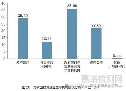 調(diào)研結(jié)果顯示(圖28),如果在我國引入救濟基金制度,35.90% 的調(diào)研對象選擇政府部門指定的第三方非營利機構(gòu)作為救濟基金的主導機構(gòu);29.30%的調(diào)研對象選擇政府部門作為主導機構(gòu);22.03% 的調(diào)研對象選擇保險公司作為主導機構(gòu);12.33% 的調(diào)研對象選擇社會非營利機構(gòu)作為主導機構(gòu)。