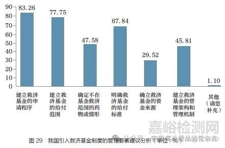 調(diào)研結(jié)果顯示(圖29),83.26% 的調(diào)研對象認為應建立救濟基金的申請程序;77.75%的調(diào)研對象認為應建立救濟基金的給付范圍;67.84% 的調(diào)研對象認為應明確救濟基金的給付標準;47.58% 的調(diào)研對象認為應確定不在救濟基金范圍的藥物或情形;45.81% 的調(diào)研對象認為應建立救濟基金的管理架構(gòu)和管理機制;29.52% 的調(diào)研對象認為應建立救濟基金的資金來源。調(diào)研結(jié)果提示,我國如果引入救濟基金制度,應采取全面措施,建立基金管理架構(gòu)和管理機制,明確救濟基金的申請程序、給付范圍、給付標準、資金來源,確定不在救濟基金范圍的藥物及情形等。