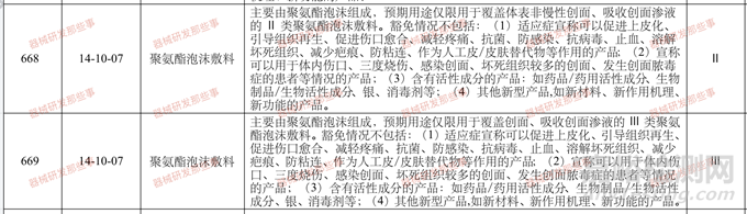 按照2017版《醫(yī)療器械分類目錄》,泡沫敷料一般按照14-10-07進行管理,此外泡沫敷料也是負壓引流護創(chuàng)裝置的一個重要組件,分類編碼為14-06-05。根據(jù)分類情況,通常按照II類或III類進行管理。在不含有活性成分的產(chǎn)品:如藥品/藥用活性成分、生物制品/生物活性成分、銀、消毒劑等;不添加其他新型產(chǎn)品,如新材料、新作用機理、新功能的產(chǎn)品等情況下,用于覆蓋體表非慢性創(chuàng)面、吸收創(chuàng)面滲液的聚氨酯泡沫敷料作為Ⅱ類管理。