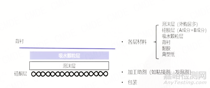 聚氨酯泡沫敷料通常由外購泡沫或企業(yè)自行發(fā)泡生產(chǎn),其泡沫吸附層和硅酮層由兩種成分按不同比例混合形成。吸附顆粒主要用于纖維層和聚丙烯顆粒,而背襯材料通常為聚氨酯,輔以粘膠和外層離型紙。在加工過程中,多層產(chǎn)品之間的粘接劑和發(fā)泡劑的使用,以及自產(chǎn)泡沫的發(fā)泡催化劑和單體等,都需要詳細記錄和說明。