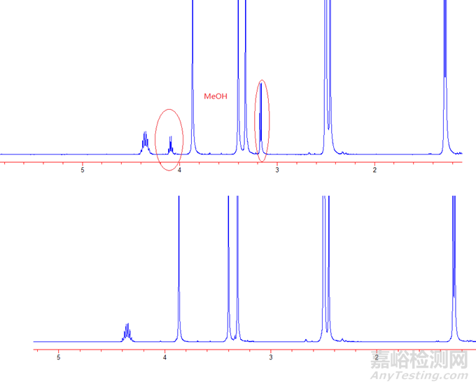 小編曾做了一個(gè)化合物,最后甲醇重結(jié)晶得到產(chǎn)物,QC純度98%,核磁有明顯的甲醇?xì)埩?,直接油泵拉,沒有效果,利用第三種方法,試了一下,重復(fù)加水三次,成功解決問題。