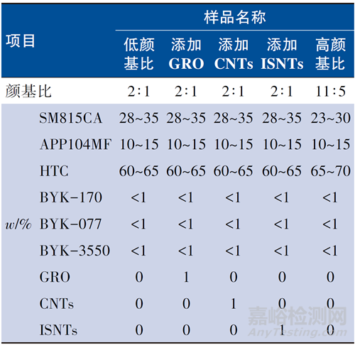 按照表1配方,將環(huán)氧樹脂、改性多聚磷酸銨、耐高溫隔熱粉HTC、氧化石墨烯/碳納米管/無機(jī)硅酸鹽納米管、分散劑、消泡劑、流平劑按照顏基比2∶1,分批緩慢加入高速分散機(jī)中分散均勻,隨后轉(zhuǎn)移至砂磨機(jī)中處理20~60 min,過濾后得到細(xì)度在50 μm左右有一定流動性的漿料,待用。其余操作不變,不添加氧化石墨烯/碳納米管/無機(jī)硅酸鹽納米管,增加體系中耐高溫隔熱粉HTC的用量,將體系的顏基比提高,得高顏基比樣品。
