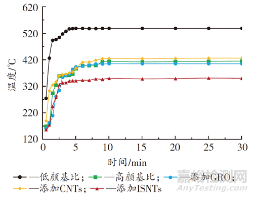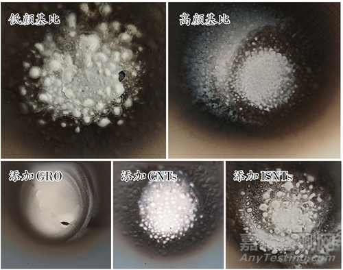 根據(jù)文獻(xiàn)報道,納米結(jié)構(gòu)的填料可以提高涂層的耐高溫性能,同時納米管狀結(jié)構(gòu)或者片狀結(jié)構(gòu)可以提高涂層的機(jī)械強(qiáng)度,改善涂層炭化過程由于內(nèi)應(yīng)力不足而產(chǎn)生的開裂問題?;诖耍狙芯糠謩e把氧化石墨烯、碳納米管和無機(jī)硅酸鹽納米管加入到較低顏基比的體系中,以期改善樣品的耐火隔熱性能。從圖1可以看出,當(dāng)將氧化石墨烯加入到體系中時,在一定程度上提高了涂層的抗開裂性能,燃燒后裂紋減少。從溫升曲線也可以看出,非涂層面的溫升情況與高顏基比樣品相似,測試時間為10 min左右時達(dá)到最高溫度403 ℃。為了進(jìn)一步提高涂層燃燒后的機(jī)械強(qiáng)度,又分別將具有納米管狀結(jié)構(gòu)的碳納米管和無機(jī)硅酸鹽納米管加入到體系中,從測試后的樣品圖片可以看出,當(dāng)將納米管狀填料加入到體系中時,涂層燃燒后幾乎無裂紋,也沒有任何脫落,提高了樣品的耐火性能和機(jī)械強(qiáng)度。此外,從圖2的溫升曲線中可以看出,加入碳納米管后的樣品在耐火測試過程中,溫升情況與高顏基比體系接近,當(dāng)測試時間在10 min左右時,達(dá)到最高溫度424 ℃。而加入無機(jī)硅酸鹽納米管的樣品與其他樣品比,溫升較快,大約5 min左右就升到了較高的溫度339 ℃,隨著測試時間的延長,非涂層面的溫度基本維持在這個溫度區(qū)間,最高溫為349 ℃。從測試結(jié)果可以看出,加入無機(jī)硅酸鹽納米管的樣品不僅可以在較低顏基比的條件下,提高涂層的耐火性能,還能提高燃燒后涂層的抗開裂性能和隔熱性能。這是因為無機(jī)硅酸鹽納米管不僅具有穩(wěn)定的納米管狀結(jié)構(gòu),可以降低涂層燃燒時的熱傳導(dǎo)速率,同時在燃燒過程中可以吸收熱量,提高涂層的防火性能,可以更好地保護(hù)基材,延緩鋰離子電池包的熱失控蔓延速率,保護(hù)電池包及其周邊設(shè)備。
