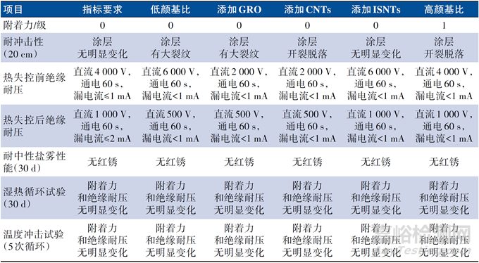 對于新能源汽車,電池包用多功能防火涂料在延緩電池包熱失控的基礎(chǔ)上,還需要具備一定的基本性能,比如附著力、電絕緣性和耐久性能。表2為不同樣品的基本性能測試結(jié)果。