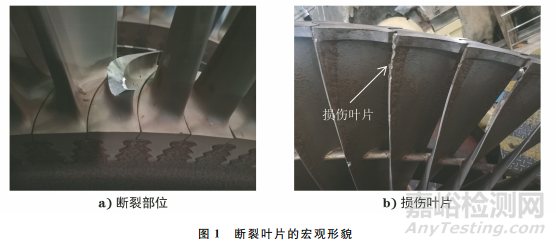 結(jié)合現(xiàn)場(chǎng)勘察,對(duì)斷裂的低壓轉(zhuǎn)子次末級(jí)葉片進(jìn)行宏觀觀察,結(jié)果如圖1所示。由圖1可知:斷裂葉片為汽機(jī)側(cè)低壓轉(zhuǎn)子次末級(jí)葉片,其中一支葉片斷裂,自葉片根部平臺(tái)上方約20mm處的葉型部位斷裂為兩部分,葉根部分仍鑲嵌于葉根槽內(nèi),葉型部分已掉入下缸,并將相鄰的多支次末級(jí)葉片和末級(jí)葉片擊打損傷;葉型中間無(wú)固定拉筋,葉根鑲嵌部位發(fā)生嚴(yán)重松動(dòng)。