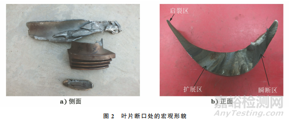 對(duì)葉片斷口處進(jìn)行宏觀觀察,結(jié)果如圖2所示。由圖2可知:掉入下缸的葉片葉型部分已發(fā)生嚴(yán)重?fù)p傷形變,鑲嵌于葉輪上的葉根部分外形完好,未見(jiàn)明顯的機(jī)械損傷;葉片斷口整體較為齊平,未見(jiàn)明顯塑性變形;斷口表面銹蝕較為嚴(yán)重,但在斷口上的大部分區(qū)域仍 可見(jiàn)眾多互相平行的“海灘狀”疲勞輝紋,觀察疲勞輝紋的擴(kuò)展及收斂方向,發(fā)現(xiàn)斷口的起裂區(qū)位于葉片出汽側(cè)邊緣處,瞬斷區(qū)位于葉片進(jìn)汽側(cè);斷口上擴(kuò)展區(qū)的面積占比約為70%,瞬斷區(qū)的面積占比約為30%;葉片表面未見(jiàn)嚴(yán)重腐蝕坑或機(jī)械損傷等缺陷。