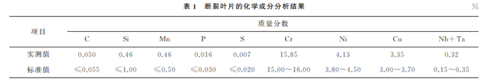 在斷裂葉片上取樣,對(duì)試樣進(jìn)行化學(xué)成分分析,結(jié)果如表1所示。由表1可知:斷裂葉片中各主要合金元素的含量均符合GB/T 8732—2014 《汽輪機(jī)葉片用鋼》對(duì)0Cr17Ni4Cu4Nb鋼的要求。