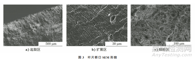 對(duì)葉片斷口進(jìn)行超聲清洗,然后利用掃描電子顯微鏡對(duì)葉片斷口進(jìn)行觀察,結(jié)果如圖3所示。由圖3可知:起裂區(qū)靠近葉片出汽側(cè)端部,表面齊平,未見(jiàn)明顯的腐蝕坑、夾雜物或機(jī)械損傷等缺陷;擴(kuò)展區(qū)可以觀察到眾多互相平行且間距細(xì)小的疲勞條帶,說(shuō)明葉片顫振形成的載荷較小;瞬斷區(qū)大部分區(qū)域呈韌性+準(zhǔn)解理斷裂特征。