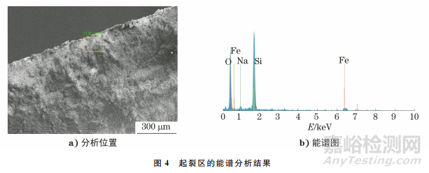 利用X射線能譜儀對(duì)葉片斷口的起裂區(qū)進(jìn)行分析,結(jié)果如圖4所示。由圖4可知:起裂區(qū)未見(jiàn)含有Cl元素的腐蝕性產(chǎn)物。