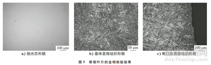 在葉片斷口處取樣,對(duì)試樣進(jìn)行金相檢驗(yàn),結(jié)果如圖5所示。由圖5可知:葉片的基體組織為回火馬氏體,未見(jiàn)粗大的淬硬馬氏體及嚴(yán)重δ鐵素體等異常組織,未見(jiàn)嚴(yán)重夾雜物缺陷;起裂區(qū)及擴(kuò)展區(qū)裂紋均以穿晶斷裂的方式擴(kuò)展,未見(jiàn)晶粒拉長(zhǎng)畸變、沿晶開(kāi)裂形貌或夾雜物顆粒等缺陷。