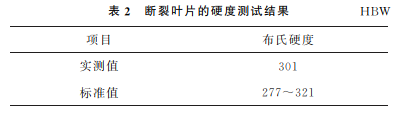 在斷裂葉片上取樣,對(duì)試樣進(jìn)行硬度測(cè)試,結(jié)果如表2所示。由表2可知:斷裂葉片的硬度滿足標(biāo)準(zhǔn)GB/T 8732—2014的要求。