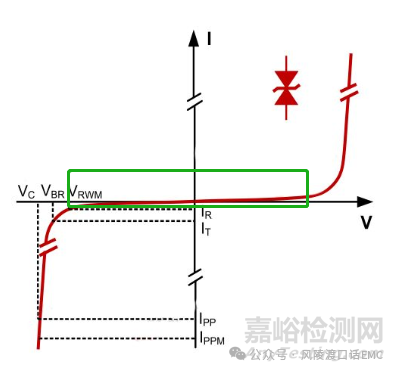 箝位電壓VC,施加規(guī)定波形的峰值脈沖電流IPP時TVS兩端測得的峰值電壓。