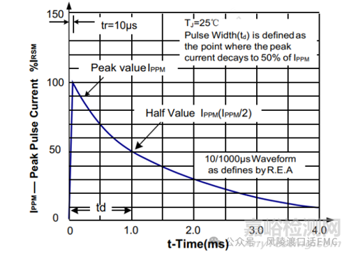 峰值脈沖電流,給定脈沖電流波形的峰值。TVS一般選用10/100μs電流波形。