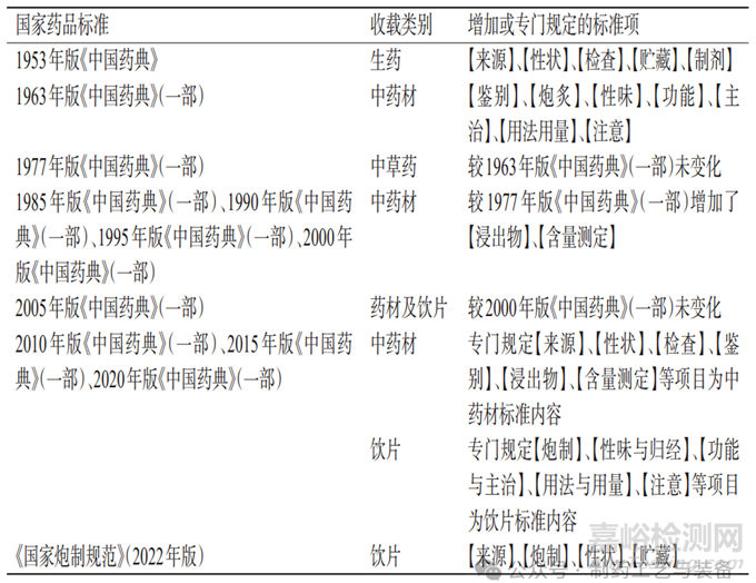 表1 中藥飲片的國家藥品標(biāo)準(zhǔn)項內(nèi)容演變
