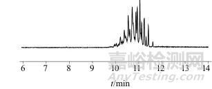 DINCH 的來源是對鄰苯二甲酸二異壬酯的芳香環(huán)氫化,得到的非平面環(huán)己烷。含有約90%的順式構型和10% 的反式構型,其九碳側鏈通常含約10%正壬烷基、35%~40% 甲基辛基、40%~45%二甲基庚烷和5%~10% 甲基乙基己基[11]。由于DINCH是一系列苯環(huán)上分支長度不同的同分異構體所組成的混合物,而這些同分異構體的含量在DINCH 中相對固定,極性卻有差異[12-13],因此在總離子流色譜圖中表現(xiàn)為一系列的簇峰(圖2)。眾多同分異構體較難實現(xiàn)定量,但當選用豐度最高的m/z 155 的離子碎片所生成的色譜圖(圖3)進行定量積分時,所得色譜圖中這些峰的峰面積之和與標樣濃度間具有良好的線性關系,而且這些單體峰相互分離沒有基質的干擾,可以作為定量依據(jù),因此選擇質荷比m/z 155的離子碎片作為定量離子。