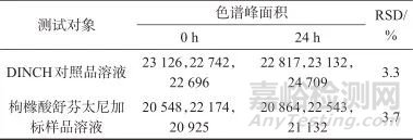 取DINCH標準溶液、枸櫞酸舒芬太尼加標樣品溶液,分別在配制完成后第0、24 h 進樣分析,重復測定3次,記錄色譜峰面積,結果見表3。由表3 可知,DINCH標準溶液和枸櫞酸舒芬太尼加標樣品溶液室溫放置24 h后,測定結果的相對標準偏差均小于5%。表明對照品溶液、枸櫞酸舒芬太尼加標樣品溶液室溫放置24 h,穩(wěn)定性良好。