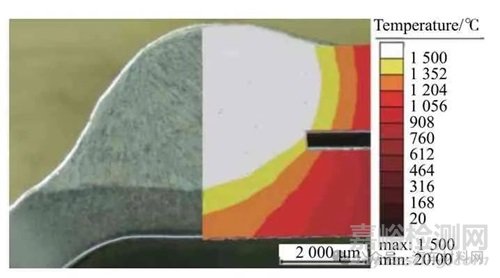 利用SYSWELD 軟件進行控制臂焊縫溫度場計算,結(jié)果如圖2 所示,1 500 ℃等溫線與焊縫熔池邊界,即焊接接頭宏觀金相圖中的焊縫區(qū)與熱影響區(qū)交界線非常接近。表明所建幾何模型尺寸與熱源模型參數(shù)合理,模擬的焊接接頭溫度場能夠準(zhǔn)確地反映焊接過程中溫度場的分布規(guī)律。