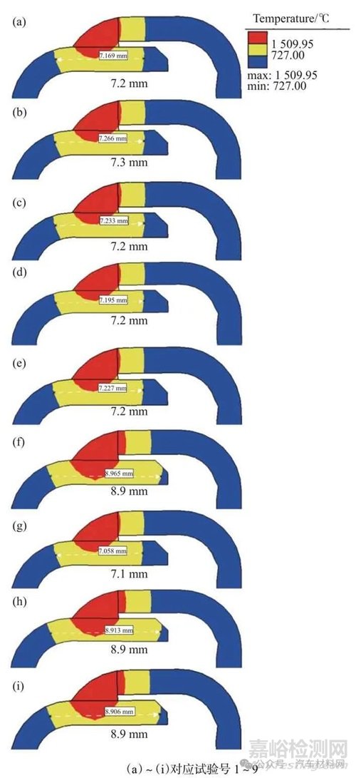 圖4 為正交試驗焊接接頭熔池和熱影響區(qū)分布示意,可以看出試驗1、2、3、4、5 和7 焊接接頭均未焊透,這主要是由于這些試驗的熱輸入在2015~2 266 J/cm,熱輸入偏小,在控制臂上下片之間的角焊縫焊根位置存在未焊透的間隙,這些小間隙的存在將影響控制臂服役的疲勞壽命;試驗6、8 和9 焊接接頭實現(xiàn)了完全焊透,這主要是由于這些試驗的熱輸入在2 527~2 701 J/cm,熱輸入量相對適中,同時從圖4 中可以看出這三組焊縫的熔深和熔寬相差不大,能保證控制臂服役的疲勞壽命。