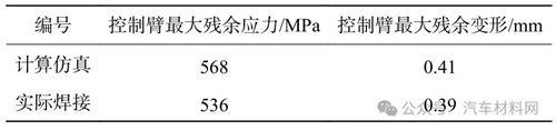 根據(jù)2.2 節(jié)中熱輸入優(yōu)化和2.3 節(jié)中焊接順序優(yōu)化,得到控制臂焊接的最優(yōu)熱輸入范圍為2 527~2 701 J/cm,最優(yōu)焊接順序為①④③⑤⑥②⑦⑧。采用優(yōu)化后的焊接熱輸入和焊接順序進行控制臂的焊接,得到控制臂的最大殘余應(yīng)力和變形如表5 所示,可以看出最大殘余應(yīng)力和變形與計算結(jié)果接近,最大殘余應(yīng)力的誤差為5.9%,最大殘余變形的誤差為5.1%,可見采用有限元計算仿真能實現(xiàn)控制臂焊接工藝的優(yōu)化,提高汽車控制臂的產(chǎn)品質(zhì)量。