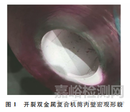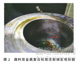 雙金屬復(fù)合機筒用離心澆鑄工藝制造,其結(jié)合了基材和合金層的特性,離心澆鑄后合金層與基材結(jié)合良好,合金層致密,硬度符合要求。在對某雙金屬復(fù)合機筒內(nèi)壁進行鏜孔后,發(fā)現(xiàn)機筒開裂(見圖1),其內(nèi)孔直徑為60mm,將其編號為試樣1。在使用雙金屬復(fù)合機筒的過程中,發(fā)現(xiàn)機筒注射端發(fā)生了漏料現(xiàn)象 (見圖2),其內(nèi)孔直徑為63mm,將其編號為試樣2。研究人員采用一系列理化檢驗方法對機筒開裂的原因進行分析,以避免該類問題再次發(fā)生。