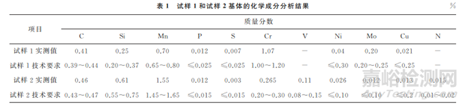 分別在試樣1和試樣2的基體上取樣,對試樣進行化學(xué)成分分析,結(jié)果如表1 所示。分別在試樣1和試樣2雙金屬層上取樣,對試樣進行化學(xué)成分分析,結(jié)果如表2所示。由表1,2可知:試樣1和試樣2基體的主要化學(xué)成分符合技術(shù)要求,試樣1 和試樣2雙金屬層的主要化學(xué)成分與供應(yīng)商的配方吻合。