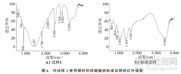 對試樣1使用的硼砂和四硼酸鈉標(biāo)準(zhǔn)試樣進行紅外光譜分析,結(jié)果如圖6所示。由圖6可知:對試樣1使用硼砂與四硼酸鈉標(biāo)準(zhǔn)試樣紅外譜圖中的吸收峰無法對應(yīng),對試樣1使用硼砂的主要成分不符合四硼酸鈉標(biāo)準(zhǔn)。