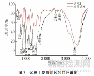對試樣2使用的硼砂進行紅外光譜分析,結(jié)果如圖7所示。由圖7可知:對試樣2使用的硼砂與四硼酸鈉標(biāo)準(zhǔn)試樣的吸收峰一致,可以判斷試樣2使用的硼砂正常。