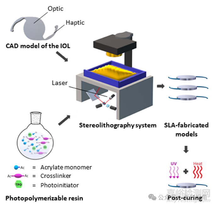 增材制造允許通過逐層沉積材料直至形成整個(gè)結(jié)構(gòu)來(lái)制造在計(jì)算機(jī)輔助設(shè)計(jì)(CAD)軟件上設(shè)計(jì)的物體。19,20在目前可用的不同類型的增材制造技術(shù)中,SLA 通常是制造鏡片的首選方法。21該工藝有許多優(yōu)點(diǎn),包括高分辨率和制造速度、可使用材料的多功能性以及同時(shí)使用它們的可能性。22這些屬性使 SLA 成為一種有前途的技術(shù),可加速新型 IOL 原型的生產(chǎn)。