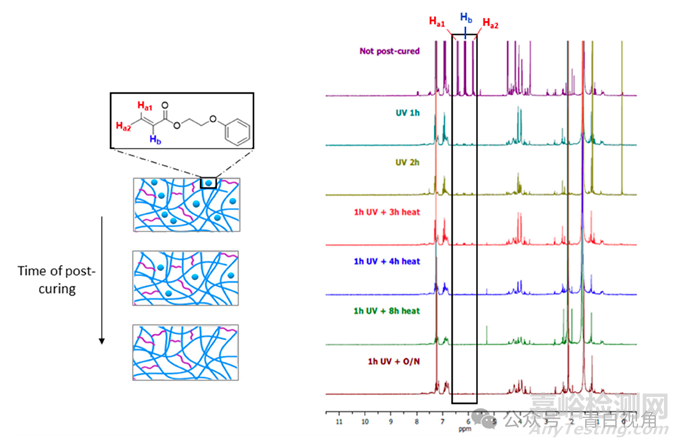 圖2:1H NMR 光譜是通過對(duì)經(jīng)過不同階段的后固化過程(用 405 nm 紫外/可見光照射 1 小時(shí)并在 80 °C 下加熱)的打印類 IOL 器件的孵化介質(zhì)進(jìn)行分析而獲得的。4.8-5.2 ppm 處的信號(hào)強(qiáng)度(以黑色矩形突出顯示)是由從聚合物中浸出的剩余未反應(yīng)單體的烯基產(chǎn)生的,隨著后固化時(shí)間的延長(zhǎng)而降低。