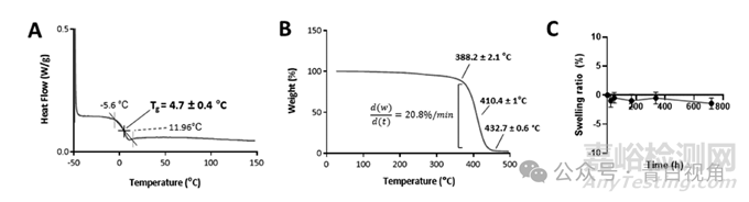 圖3:形成 SLA 制造植入物的生物材料的物理化學(xué)特性。這時(shí)間G是從 DSC 分析的第三個(gè)加熱循環(huán)中獲得的,值為 4.7 ± 0.4 °C (n = 3) (A)。聚合物熱重分析得出的熱分析圖顯示,它在 388.2 ± 2.1 °C 時(shí)開始降解(n = 3) (B)。描繪一個(gè)月內(nèi)溶脹比變化的線圖表明,聚合物在這段時(shí)間內(nèi)沒有吸收任何水(n = 4) (C)。