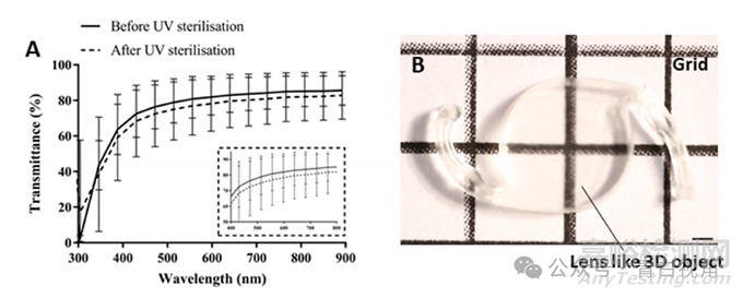 通過測(cè)量材料的光學(xué)透射率來(lái)研究打印的透鏡狀模型的透明度。分析結(jié)果表明,植入物透射了它們所暴露的 80-85% 的可見光(圖4(A))。紫外線滅菌導(dǎo)致透光率下降 3%。還通過在網(wǎng)格線背景下對(duì)器件進(jìn)行成像來(lái)評(píng)估器件的光學(xué)特性(圖4(B))。這表明,根據(jù)透射率測(cè)量獲得的結(jié)果,植入物相對(duì)透明并且允許網(wǎng)格線可視化。
